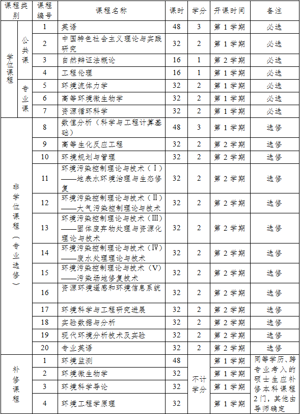 (一)本专业领域硕士研究生工程硕士总学分不低于32学分,其中课程学习不少于24学分。公共学位课必修4门,7学分,专业学位课必修3门,6学分,非学位课选修6门,12学分。社会实践4学分(具有2年及以上企业工作经历的工程类硕士专业学位研究生专业实践时间不少于6个月,不具有2年企业工作经历的工程类硕士专业学位研究生专业实践时间不少于1年),论文选题1学分,参加相关学科学术活动5次以上得2学分,低于5次不得学分。