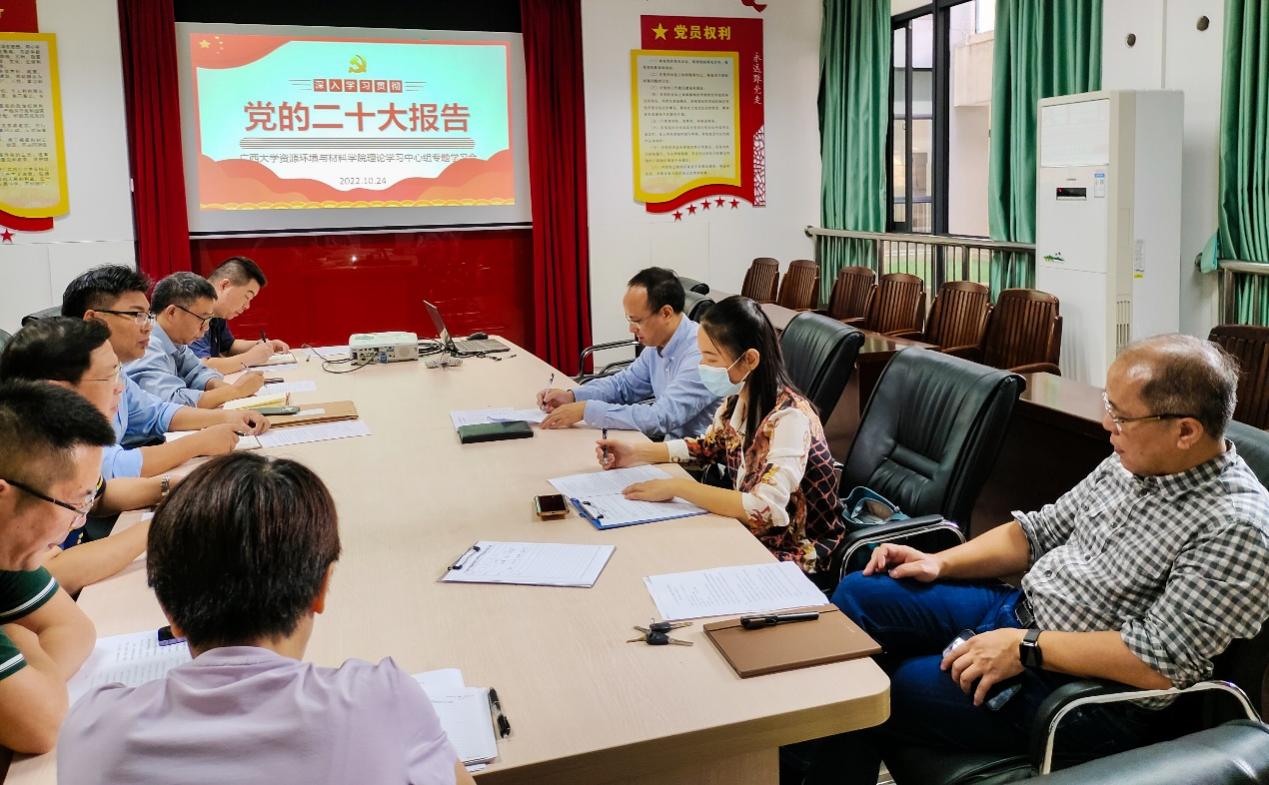 学院党委书记沈大强在会上领学了党的二十大精神,以及习近平总书记在参加党的二十大广西代表团讨论时强调的“心往一处想劲往一处使推动中华民族伟大复兴号巨轮乘风破浪扬帆远航”重要讲话精神、在中国共产党第二十次全国代表大会闭幕会上重要讲话精神、《中国共产党第二十次全国代表大会关于十九届中央委员会报告的决议》、《中国共产党第二十次全国代表大会关于十九届中央纪律检查委员会工作报告的决议》。指出党的二十大精神博大精深,思想深邃,内涵丰富,要求理论学习中心组成员、院领导班子成员、教师骨干必须按照校党委常委会第176次会议精神要求认真学习,完整、准确、全面的领悟其精神内涵,结合学院工作和岗位职责要求融会贯通,带头做好学习宣传,并贯彻落实到学院的人才培养、学科专业建设、博士点申报、重点实验室建设等工作中,以新征程新时代的高质量发展要求,带头创新,踔厉奋发,奋勇争先,引导教职工立德树人做好“四有好老师”、“四个引路人”,引导学生“五育并举”,争做社会主义现代化建设的“五有”领军人、接班人。