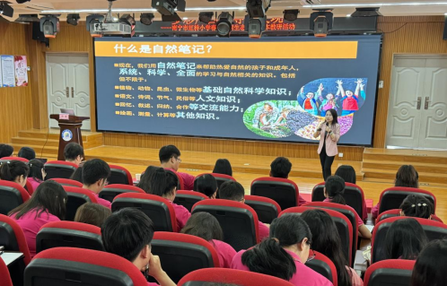老师冷冰博士前往南宁市虹桥小学开展环境保护主题讲座。冷老师向同学讲述保护生物的重要性,普及生物多样性知识,倡导人与自然和谐相处的生态理念。她结合个人科研经历,与该校师生分享以自然笔记为载体、进行自然教育活动规划设计的经验方法。