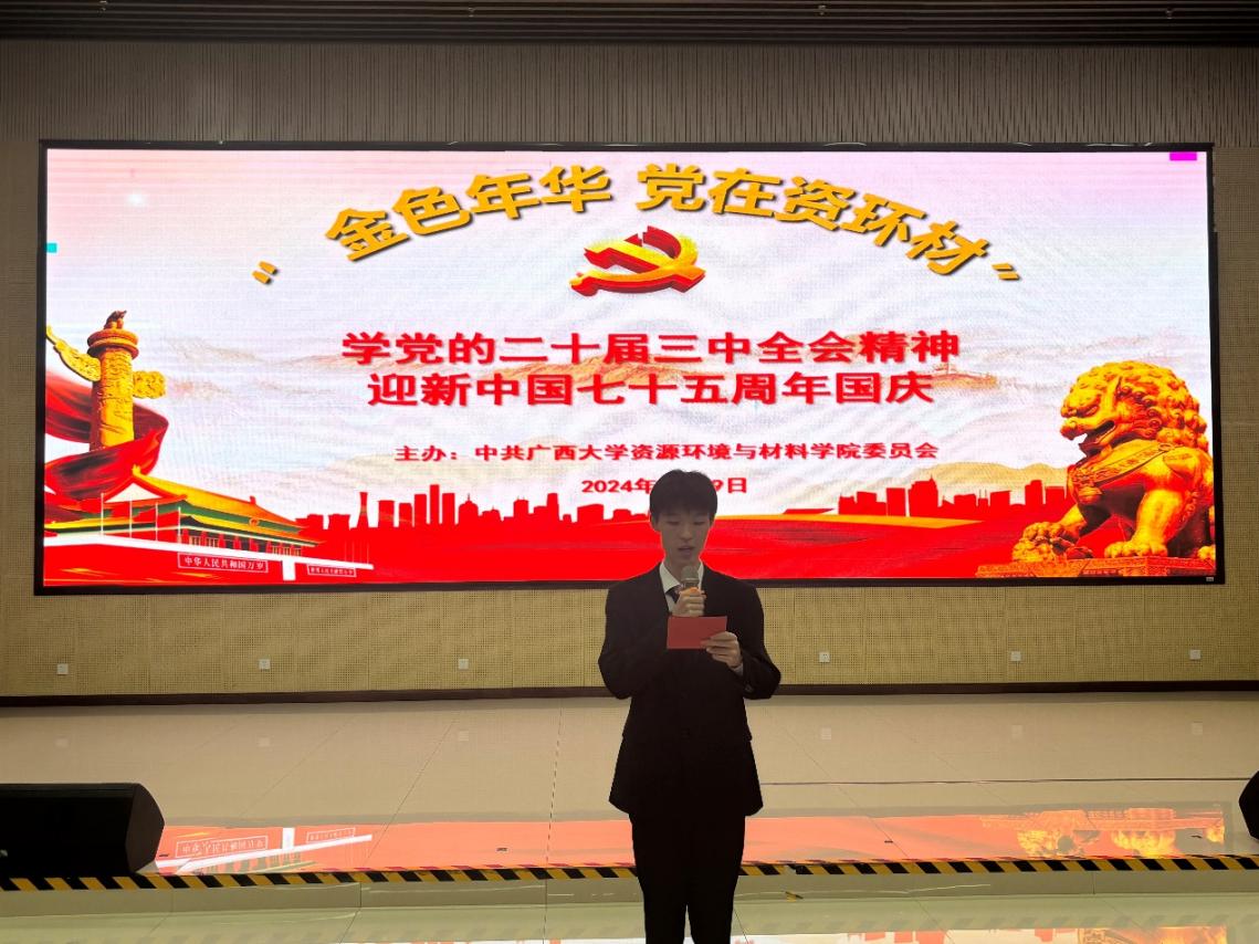活动在嘹亮的国歌声中拉开帷幕。沈大强书记上学习贯彻党的二十届三中全会精神专题党课,从内容框架、内涵要义、时代要求、坚定践行四个角度解读《中共中央关于进一步全面深化改革、推进中国式现代化的决定》(以下简称《决定》),号召党员同志原原本本、原汁原味学习领会习近平总书记重要讲话和全会《决定》精神,切实把思想和行动统一到党中央各项决策部署上来,做党和国家事业蓝图的践行人;鼓励师生把学习贯彻党的二十届三中全会精神和各项工作结合起来,坚定教育教学改革勇气,增强学业科研改革魄力,高效发挥“资源-环境-材料”学科交叉融合优势,扎实学好本领,打造特色专业。