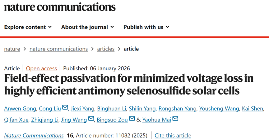 邹炳锁教授领衔的纳米光子学材料与技术团队在硒硫化锑(Sb2(S,Se)3)太阳电池领域取得新进展,相关成果以“Field-effect passivation for minimized voltage loss in highly efficient antimony selenosulfide solar cells”为题,发表在国际顶级期刊自然通讯 (Nature Communicatios)。资环材学院2025级博士研究生龚安稳为第一作者,邹炳锁教授、刘聪助理教授、暨南大学麦耀华教授和广东工业大学王晶副教授为共同通讯作者,色情