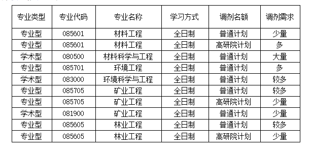 材料工程(085601)、矿业工程(085705)、林业工程(085605)专业的招生指标有普通计划和高研院计划,因此,报考以上专业的所有调剂考生通过复试资格审查后,在复试前必须填写提交一份《培养计划选择意向表》和承诺书(见附件2和附件3)。