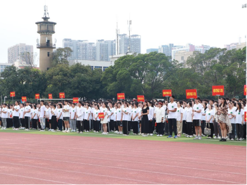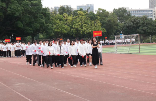 开幕式现场,各班级方阵统一着装,迈着整齐的步伐,依次走过主席台,一一展现集体风采。同学们脸上洋溢着青春活力、自信大方的笑容,嘹亮的口号声响彻体育场上空。田径场内,各班井然有序地列队,齐唱中华人民共和国国歌。