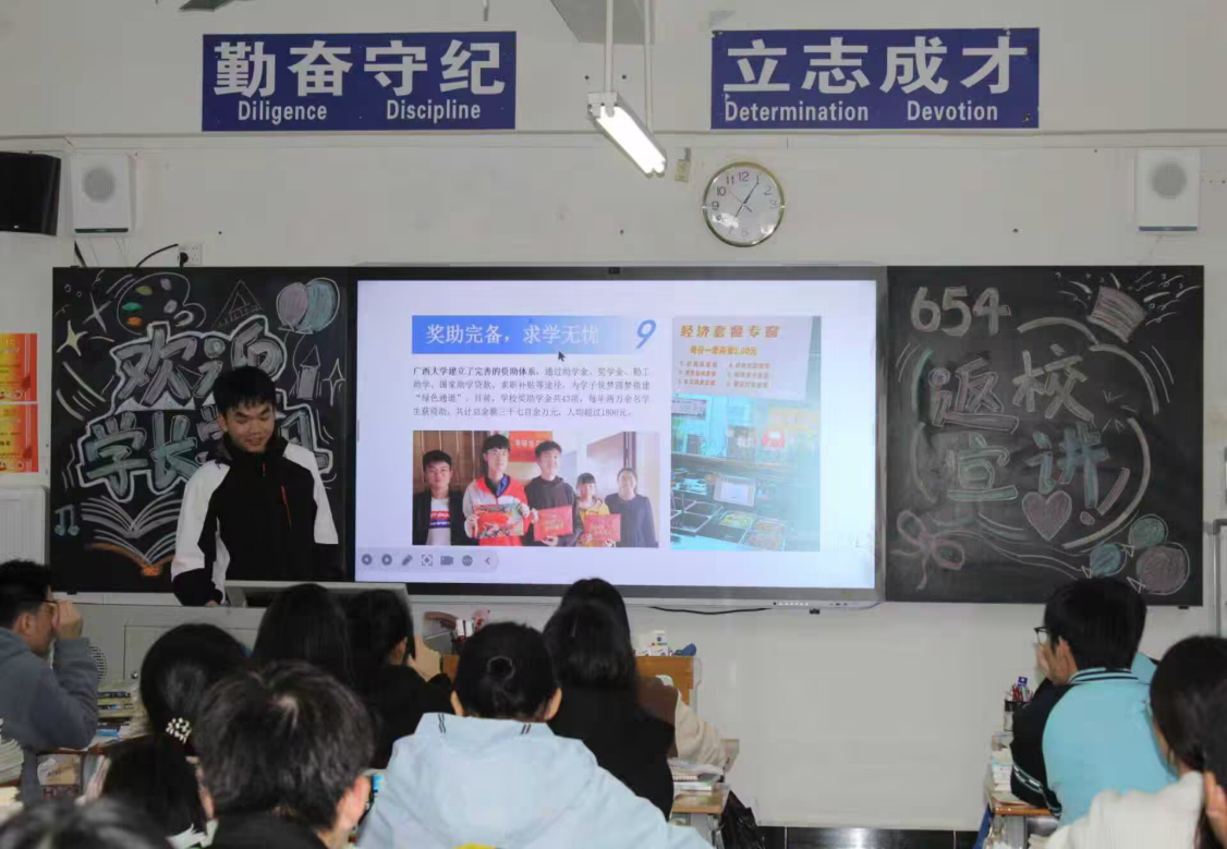 2月5日下午,环工251班邓喆回到母校南宁市第二中学,与学弟学妹们面对面交流大学生活的精彩点滴,分享高效备考的学习经验。从西大的优势学科到丰富的校园文化,从资助政策到成长路径,让更多二中学子对西大有了全面而立体的认识。“我们不仅分享故事,更希望传递一份信心,激励更多优秀同学选择西大、圆梦西大,”邓喆如是说。