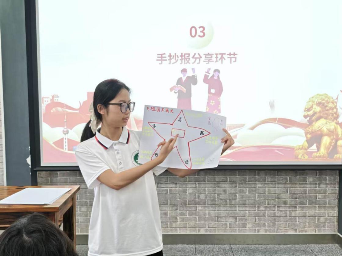 随后,各小组代表依次上台展示并讲解作品内容,分享创作思路与学习感悟。精彩的展示赢得阵阵掌声,现场互动频繁、氛围活跃。活动最后,田春老师和周大淇老师对同学们的表现给予充分肯定,并寄语大家将学习成果转化为实际行动,把爱国之情落实到学习与生活中,在实干中不断提升自我、服务社会。