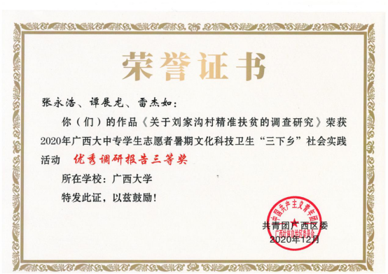 环工182班张永浩同学荣获2020年广西大中专学生志愿者暑期文化科技卫生“三下乡”社会实践活动优秀个人,环工182班张永浩、谭展龙、雷杰如同学的《关于刘家沟村精准扶贫的调查研究》报告荣获2020年广西大中专学生志愿者暑期文化科技卫生“三下乡”社会实践活动优秀调研报告三等奖。他们利用2020年暑期对山东省日照市刘家沟村当地的精准扶贫工作进行了深入调研,结合实际情况与学所知识,撰写出了高质量的调研报告,为当地扶贫工作出谋献策。