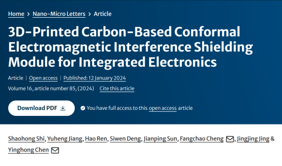 程芳超老师团队在碳基电磁屏蔽模组的3D打印先进制造领域取得重要进展,研究成果以“3D-Printed Carbon-Based Conformal Electromagnetic Interference Shielding Module for Integrated Electronics”为题,发表在SCI收录期刊《Nano-Micro Letters》(中科院1区,IF =26.6)上。论文通讯作者为色情