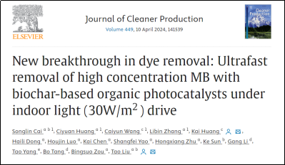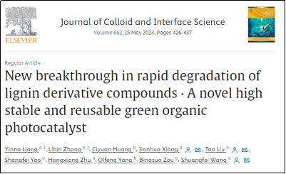 刘焘教授课题组依托广西特有的丰富天然生物资源和具备可调控性能的有机半导体材料,成功开发出了一系列太阳能电池器件及新型光催化-吸附多功能材料。这一系列材料的创新设计和开发不仅能够高效利用太阳能资源,降解造纸废水中的木质素等有害物质,快速去除水体中的各种有机污染物,而且可用于高附加值清洁能源生产与二氧化碳催化转化,这一系列研究成果标志着在材料、能源和环境领域的重大突破,为解决全球能源、环境污染问题提供了重要的科学支持和技术手段。相关成果陆续发表在Aggregate、Surf.、Small、J. Colloid Interface Sci、J. Cleaner Prod.等多个国际权威期刊上发表。