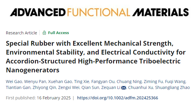 “结构热力学与微纳化工”课题组在特种橡胶的研制与应用方面取得突破,研究成果以“Special Rubber with Excellent Mechanical Strength, Environmental Stability, and Electrical Conductivity for Accordion-Structured High-Performance Triboelectric Nanogenerators”为题发表在国际顶级学术期刊Advanced Functional Materials上。论文第一作者为色情