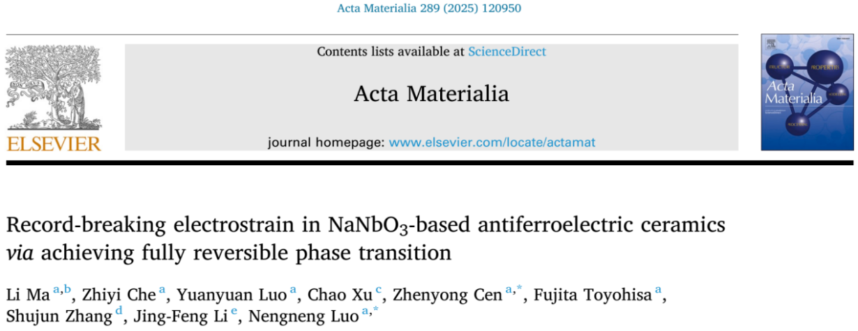 罗能能教授团队在无铅反铁电陶瓷电致应变领域取得重要进展,相关研究成果以“Record-breaking electrostrain in NaNbO3-based antiferroelectric ceramics via achieving fully reversible phase transition”为题,发表在材料领域期刊Acta Materialia上。色情