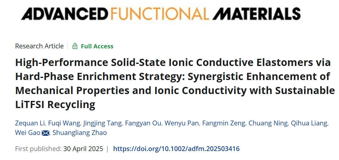 “高分子及结构板材”团队在固态离子导电弹性体研究方面取得新进展,研究成果以High-Performance Solid-State Ionic Conductive Elastomers via Hard-Phase Enrichment Strategy: Synergistic Enhancement of Mechanical Properties and Ionic Conductivity with Sustainable LiTFSI Recycling为题,发表在国际知名期刊Advanced Functional Materials上。文章第一作者为助理教授李泽权,通讯作者为副教授高伟,色情