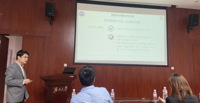 Theerachai Bongkarn教授首先以《Optimal Bi0.8Ba0.2FeO3 Doping in Bi0.5(Na0.77K0.20Li0.03)0.5TiO3 Multiferroic Ceramics Synthesized by the Solid-State Combustion Technique》为题,深入浅出地讲解了多铁材料的定义、特性及其广泛应用。他特别强调固态燃烧技术在合成多铁陶瓷中的独特优势,并详细介绍了BNKLT-xBBF陶瓷的最佳掺杂量及其性能优势,展示了无铅多铁陶瓷合成与性能优化的最新研究成果。Theerachai Bongkarn教授的讲解逻辑清晰、内容详实,极大地促进了与会师生对多铁材料结构-性能关系的深入理解。