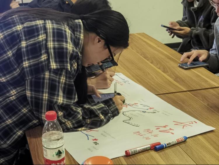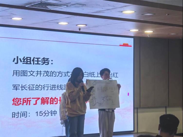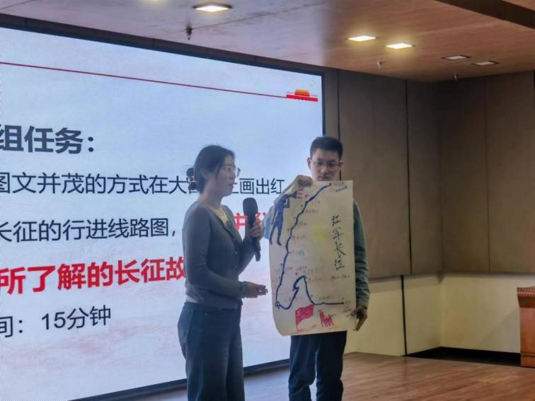 活动现场,党员们分成不同组别,以图文并茂的方式在描绘红军长征行进路线图,重温长征历史。各小组派代表分享长征故事,在一个个动人的历史故事中感悟红军战士们艰苦奋斗、自强不息的精神。此外,大家现场编排演练,亲身演绎血战湘江、飞夺泸定桥、巧渡金沙江、会宁会师四个历史事件,切身体悟中国工农红军长二万五千里长征路上的艰难险阻。