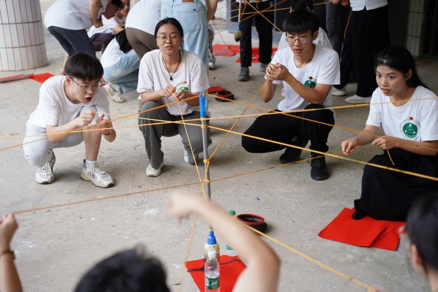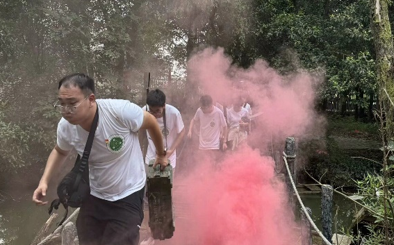 在红军长征突破湘江烈士纪念碑园中,宣讲团成员肩扛“弹药箱”,臂膀挂“枪”,手握“大刀”,紧跟队友步伐,行走在山路上,合作书写红色标语,跨过悬绳独木桥,一场别开生面的红军长征体验式教学活动正在进行。