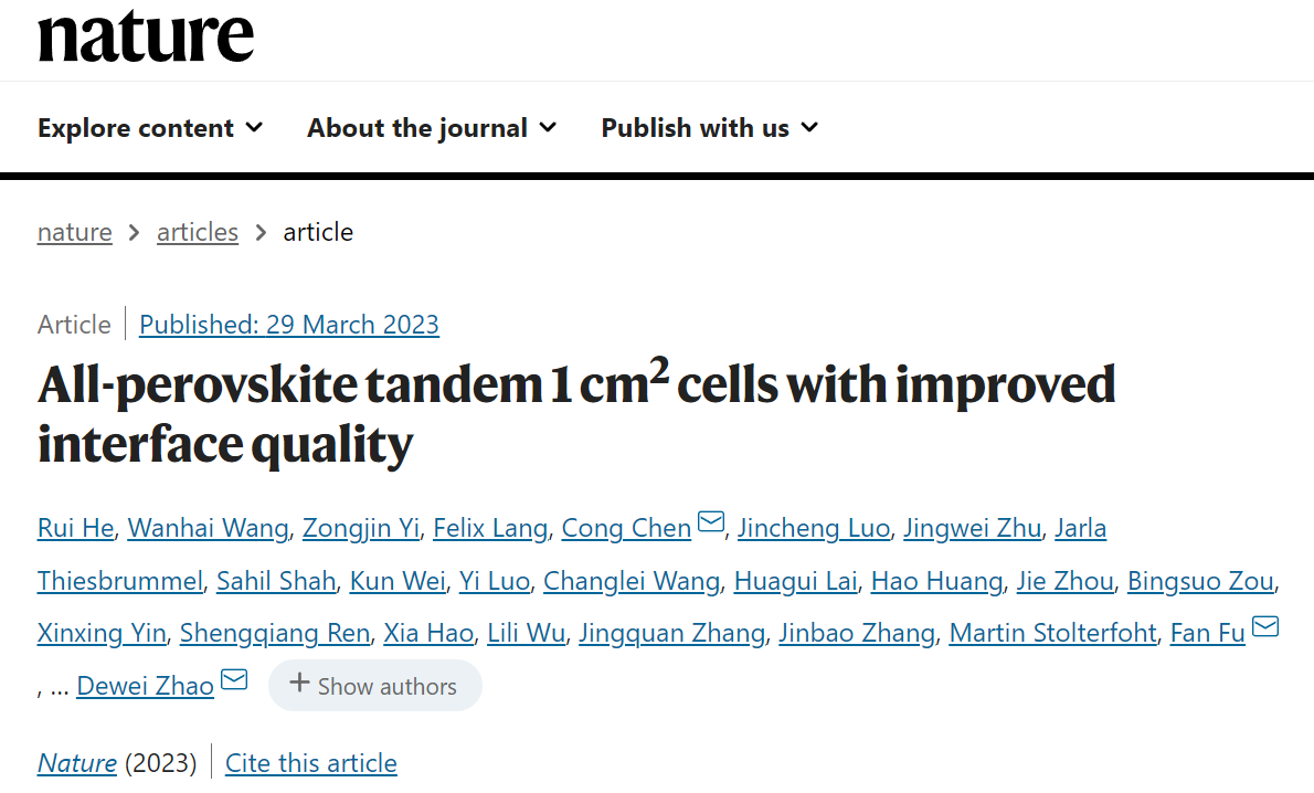 光电材料与技术团队邹炳锁教授和黄浩博士与四川大学、厦门大学等单位合作研究成果以“All-perovskite tandem 1 cm2 cells with improved interface quality”为题发表于nature。