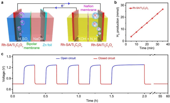 该系统基于高度分散于氧功能化Ti3C2Ox MXene表面的Rh单原子催化剂(Rh-SA/Ti3C2Ox)。该催化剂对全pH析氢反应和肼氧化反应均表现出显著催化活性。在自驱动双制氢系统中使用Rh-SA/Ti3C2Ox作为电极,结合Zn-H2电池和全肼电解单元,可以实现45.77 mmol h-1的超高产氢率。密度泛函理论计算表明,原子分散的单个Rh原子不仅使吸附H的自由能更具热中性,而且还大大降低NHNH2脱氢的自由能垒。
