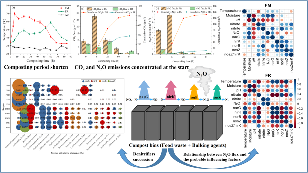 冯庆革教授团队与广西力源宝科技有限公司合作,通过创新一种无需强制通风,无需翻堆的静态好氧堆肥工艺,使厨余垃圾在短周期堆肥的过程中,表现出了极快的升温速率,以及短期集中的温室气体排放特征,是一种很有前途的堆肥新工艺。该团队还重点对厨余垃圾堆肥过程的尾气排放行为进行了探究,通过分析堆肥过程中理化性能参数的变化,结合反硝化菌群的演替及相关反硝化基因的丰度差异,阐明了厨余垃圾快速堆肥工艺中温室气体的排放规律及影响因素,为厨余垃圾的快速无害化处理和温室气体排放评价提供了有价值的参考。